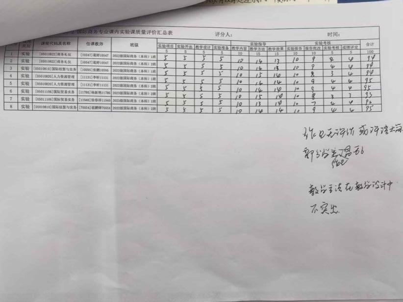 检查过程中,检查组严格依据既定考核标准,围绕前期准备、教学过程、教学效果三大核心开展量化评分。考核体系采用百分制,其中前期准备占20分,实验聚焦实验项目、实验开出率、教学设计、实验准备,实践聚焦管理制度、场地准备;教学过程占40分,实验聚焦教学内容、教学方法、教学效果,实践聚焦安全制度与措施、指导教师、教学文件;教学效果占40分,实验聚焦实验报告、报告批改、实验考核、成绩评定,实践聚焦学生实训情况、实训质量。