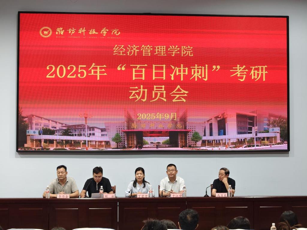 为精准对接考研学子冲刺阶段需求,破解备考瓶颈、凝聚奋进力量,9月3日下午,经济管理学院于经管报告厅举行2025年“百日冲刺”考研动员会。经济管理学院院长丁莹莹,党委书记于江学,副院长刘冰,学业规划导师高万东教授、李乃金老师及2026届考研学子参加会议。