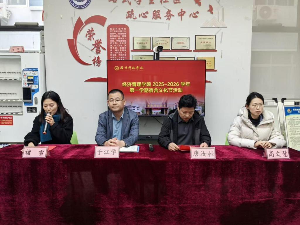 为推动一站式社区育人建设,营造文明和谐的住宿氛围,提升经管学子集体意识与归属感,经济管理学院于11月24日在一站式社区举办2025-2026学年第一学期宿舍文化节活动。公寓管理中心副主任唐汝恒、经济管理学院党委书记于江学、团总支书记褚雪、学生科科长高文慧及优秀宿舍成员代表出席活动。