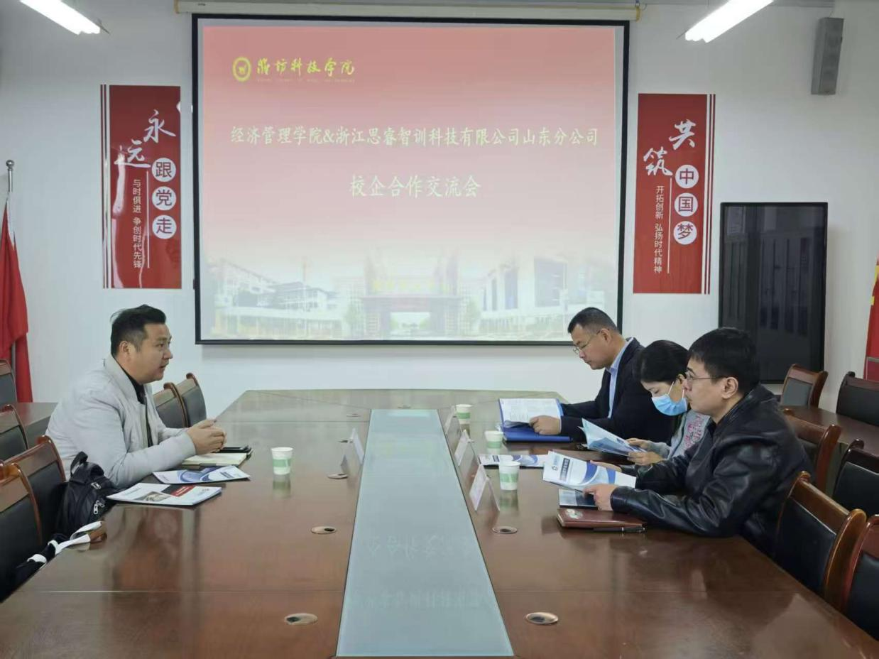 为精准对接产业人才需求,深化产教融合协同育人,促进学生高质量就业,经济管理学院与浙江思睿智训科技有限公司山东分公司于11月27日在210会议室开展校企合作交流会。经济管理学院院长丁莹莹、党委书记于江学、浙江思睿智训科技有限公司山东分公司总经理卜小刚、国际经贸系主任陈一铭等参加此次会议,会议由经济管理学院副院长刘冰主持。