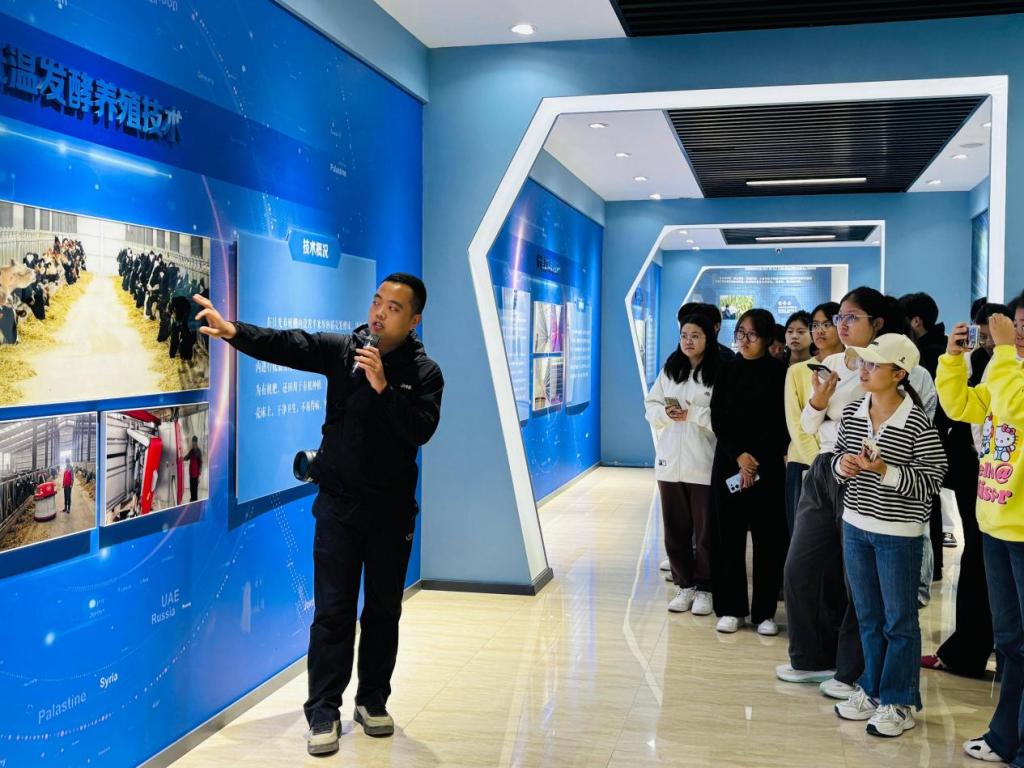 在奶牛养殖场,同学们亲眼目睹了标准化、规模化的畜牧生产场景。从智能饲喂到健康监测,从环境控制到奶质管理,数字化手段已贯穿养殖全流程。这一应用场景正是“数智新农人”理念在畜牧领域的生动延伸,也让同学们对智慧农牧业的整体图景有了更系统的认知。