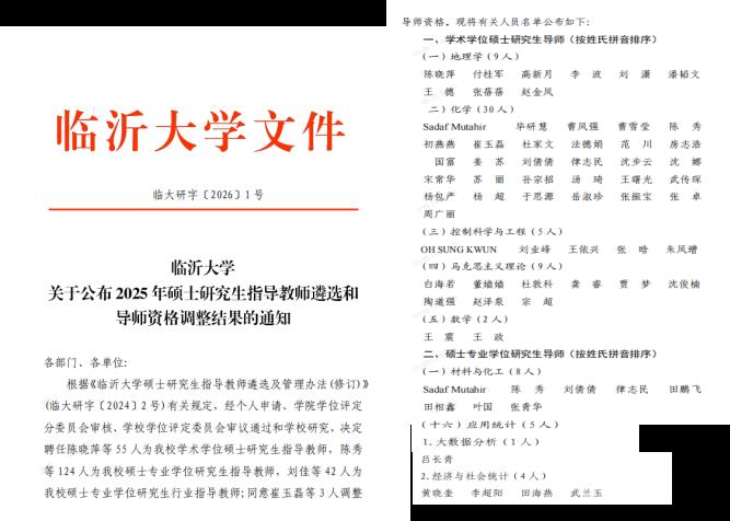 近日,临沂大学正式公布2025年硕士研究生指导教师遴选结果,我校经济管理学院李超阳、田海燕两位教师凭借丰富的科研成果和实践指导经验,历经个人申请、临沂大学二级学院学位评定分委员会审核及学校学位评定委员会审议等严格遴选程序,成功受聘为临沂大学经济与社会统计方向硕士专业学位研究生导师。这不仅是对两位教师个人学术能力与指导水平的高度认可,更为经济管理学院深化研究生联合培养、拓展学科资源注入了新的活力。