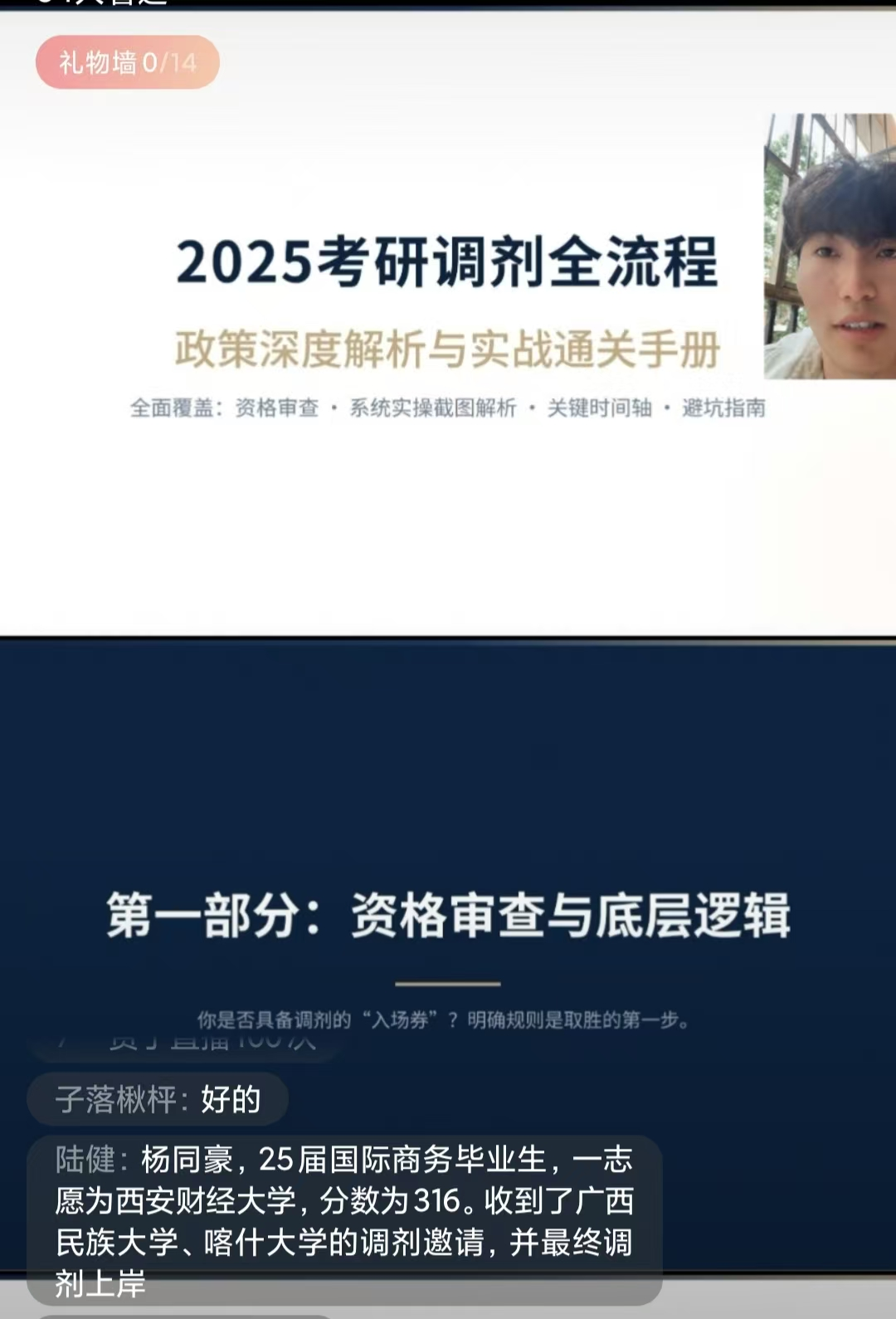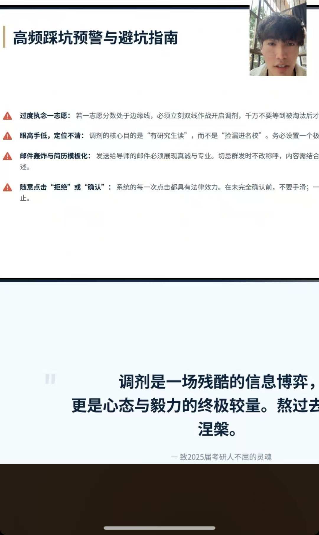 杨同豪结合自身考研调剂经历,围绕政策解读、信息获取、志愿填报等关键环节,进行了系统全面的讲解。他首先分析了调剂政策背后的逻辑,梳理了调剂的基本条件,帮助同学们明确申请调剂的前提条件,为后续准备打下基础。接着,他通过展示考研调剂时间轴,引导大家整体把握调剂进程,增强对时间节点的敏感性和调度能力。在志愿填报环节,他以个人操作为例,逐步演示了调剂系统的填报流程,帮助同学们更直观地理解操作方法。此外,他还梳理了调剂过程中常见的误区与易错点,并提出了针对性建议,助力大家规避风险、少走弯路。