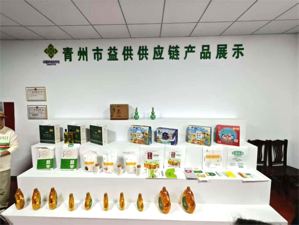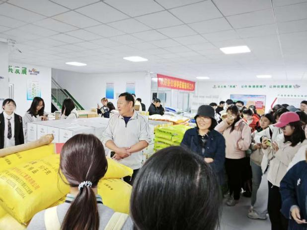 在服务中心,工作人员向师生介绍了合作社土地的规模化运营实践。通过整合农机资源,开展从耕地、播种到采收的全程托管服务,有效提升了土地利用效率。面对东营沿海七千亩重度盐碱地,中心运用“足量灌水压碱”技术成功种植水稻,形成可复制的盐碱地治理方案。植保无人机、专业烘干设备等现代农业装备的应用,进一步体现了农业从传统农资服务向智慧化管理的转型。在农产品展厅,师生深入了解合作社土地产出的原生态面粉、花生油等特色农产品。王超经理以面粉为例,介绍了其高蛋白含量、低温低速加工工艺等特点,阐释了“绿色种植—精深加工—品牌打造”的产业链价值。目前,这些产品已逐步拓展市场,并通过线下展销提升品牌影响力。调研中,师生还了解到中心正积极构建“生产+加工+销售”全产业链,推动电商直播与生态循环农业融合发展,实现经济效益与生态保护的双赢。同学们围绕农技服务、产业融合等议题与工作人员展开交流,对供销体系在农业经济中的纽带作用有了更深理解。